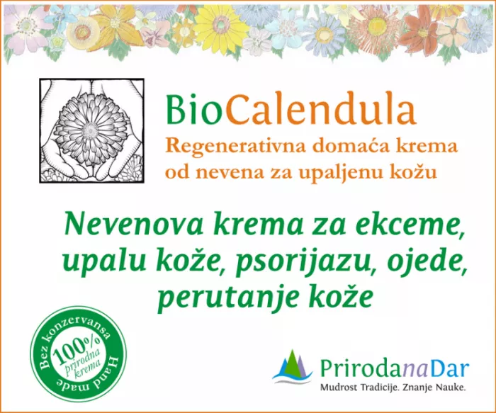Izabrali ste BioCalendula nevenovu kremu, tradicionalni prirodni preparat čija je originalna receptura nastala na planini Tari, pored Zaovinskog jezera, u Jugozapadnoj Srbiji. BioCalendula je visokokvalitetna prirodna krema na bazi domaćeg lekovitog bilja i prirodne podloge. BioCalendula nema u sebi nikakvih konzervansa, veštačkih boja ni sintetičkih mirisa. Sve je prirodno.