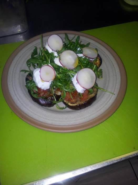 Par kolutovu izgrilovanog patlidžana (4-5) zavisi od velicine tanjira, poredjat ćemo na dno. Preko toga patlidžan prekrivamo paradajz salsom, za tu količinu patlidžana vam neće biti potrebno više od 2 kašike salse. Sve se redja jedno preko drugog, ne mešaju se namirnice iz razloga da bi na tanjiru bilo sve pregledno i kao što vidite sa slike, možete raspoznati šta u stvari jedete bez nekog preteranog objašnavanja.
