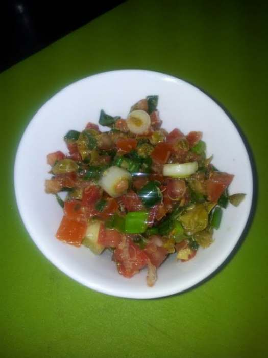 Samo koru svezeg paradajza iseckati konkase (na kockice ), mladi luk na kolutove i usitniti još jako malo kapra.