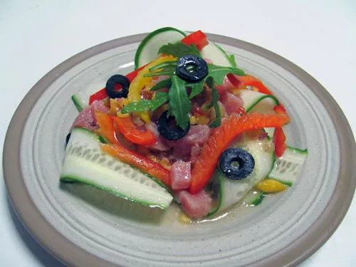 Preko toga stavljamo papriku sečenu na zilijen, crne masline isečene na kolutove i na vrh par listova sveže rukole.