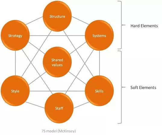 Sedam ključnih elemenata dobro vođenih organizacija su struktura, sistemi, strategija, zajedničke vrednosti, osoblje, veštine i stil. Svi elementi su povezani u jednu jedinstvenu celinu, gde svaki elemenat ima organsku povezanost sa svim ostalim elementima. Elementi su međuzavisni i dorađeni do detalja.