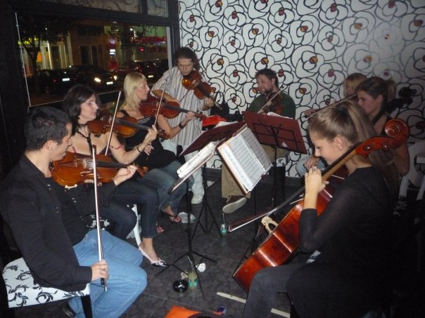 Odjednom  nastaje  komesanje, glasni uzvici, aplauz. Ulazi grupa ljudi sa instrumentima. Smestaju se oko pianina,  rasklapaju svoje pulteve, stimuju se i krece svirka! I to ne bilo kakva! Dvorzak klavirski kvintet br.2! Muzicari su sjajni. Dve simpaticne azijatkinje sviraju violine i medjusobno se dopunjuju  svojim deonicama, naspram njih je temperamentni Indijac sa violom, buckasti Poljak  je celista a pianino, iako rastimovan, svira osecajni  Australijanac.