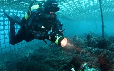 A steel mesh cage the size of a volleyball field shields the wreck, which is about 67 feet long and 35 feet wide. At least 700 amphoras are visible above the seabed.