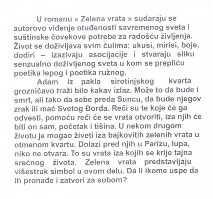 „Zelena vrata“ imaju osobenost rasturenog života. Žednog života. Sile svih opstajavanja i svih stvaranja.