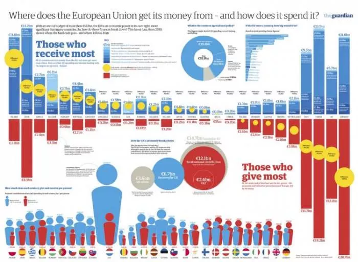 Ko u Evropskoj uniji daje koliko novca a ko uzima evropski novac. Za očekivati je da se evropski novac uzima od jednih i daje drugima ali ne! Evropski novac teče svima i od svih. Kako to izgleda na Infografika slajdu pogledajte dole.