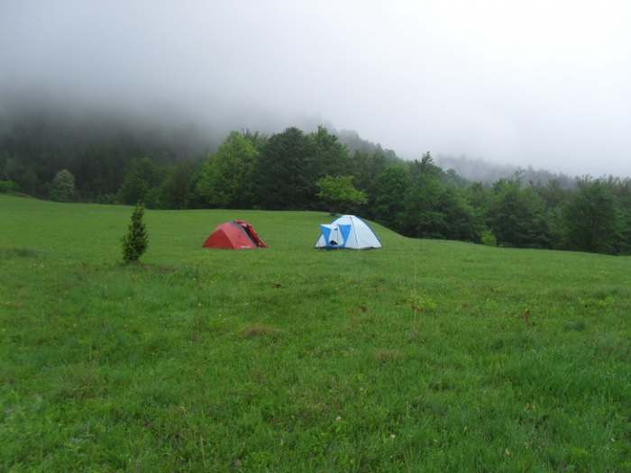 Već je bilo oko 17h. Svjetao dan je dobio rani, mračni oblik. Kada je kiša prešla u tišu varijantu, krenusmo dalje. Posle 50 metara, ugledah ironiju. Sa druge strane puta, sakrivene u šumarku, dvije vikendice sa velikim tremom. Sklonište za neki drugi put. Nastavak je sledio pored katuna, gdje kratko pozdravismo dedu i babu, koji su preko ljeta čuvali stado. Ostatak grebena nas je vodio blatnjavim putićima i mokrim livadama. Spuštanje je zadrlo u noć. Pronađosmo željenu lokaciju. Na 950 m pružao se veliki plato livada, presječen riječicom koja je vijugala i obrušavala se niz planinu, skupljajući darove nekoliko potoka u sebe. Sat pokaza 21,30h. Malo iznad rijeke postavismo šatore i ubacismo stvari. Već smznut i umoran, posle 24km, ipak se ubacih u nabujali potok. Ovaj put sam urlao od hladnoće. Niko me nije čuo. Marko ponovi moju seansu. Pod svjetlošću lampi, skuvasmo čaj i malo večerasmo. Umor je blaga riječ. Nije bilo snova. Samo bacanje u ponor.
