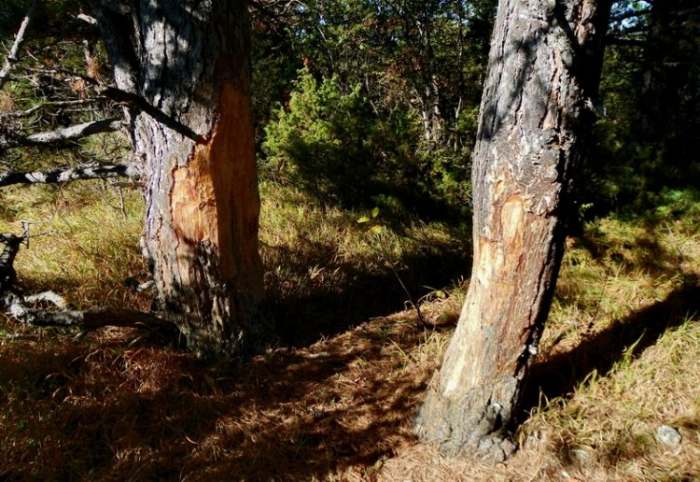 Ne, nisu zveri gulile luč sa bora, to je uradio čovek, ali su vidljive velike crne dlake divljih svinja koje su ostale posle češanja o drvo sa koga se cedila smola.