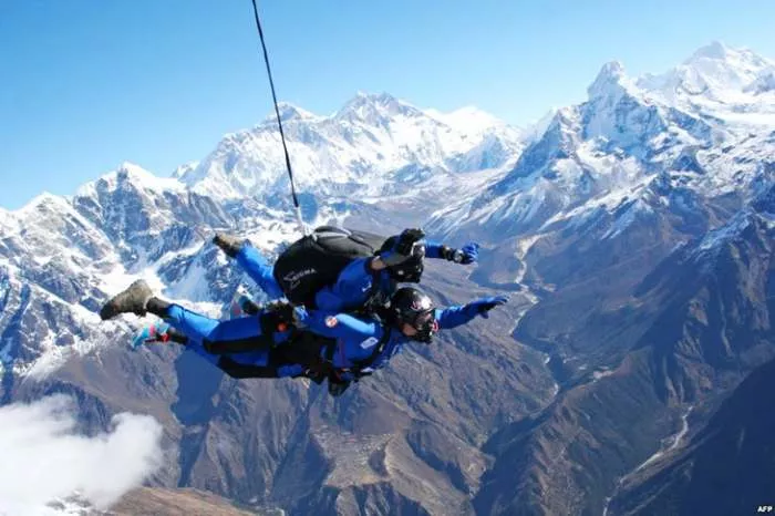 Nepal – Francuz Mark Kop koji boluje od multiple skleroze uz podršku još jednog padobraca nad regijom Mont Everesta, 27. oktobar 2013. Foto: AFP / Ryan Jackson