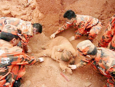 Celi tim radio je zajedno, pažljivo su uklonili gomile uništenih predmeta oko tela mrtve žene. Bila je tu 3-mesečna beba umotana u cvetnu pokrivku ispod njenog mrtvog tela. Očigledno, žena je napravila najveću moguću žrtvu da spasi svog sina. Dok se kuća rušila, ona je iskoristila svoje telo kao zaklon, da bi zaštitila svog sina. Mali dečak je i dalje mirno spavao, kada ga je vođa tima spasilaca pokupio.