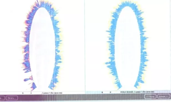 Slika desno- Vidljiva promena je nastala nakon 15-minutnog prisustva u polju delovanja Teslinih talasa na odstojanju od 2 m od uređaja T-7. Aura testirane osobe se ”popunila”, a na mestima na kojima je bila naglašenija, energetski nivo je smanjen.