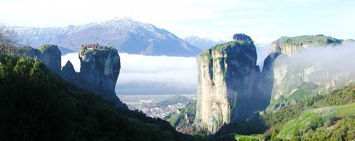 Manastirsko naselje Meteora smešteno je na ogromnim i strmoglavim stenama koje se naglo uzdižu na severozapadnom delu Tesalijske ravnice (Grčka), gde se susreću sa podnožjem masivnog planinskog lanca Pindos.
