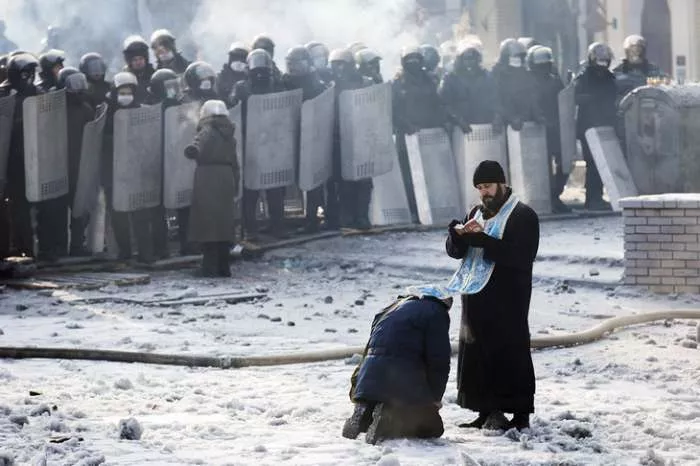 Pravoslavni sveštenik čita molitvu verniku ispred kordona policije – Kijev, Ukrajina, januar 2014 godina.