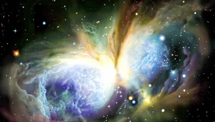 Bleštavi globus Kosmičke Sveukupnosti stao je da se širi vrtoglavom brzinom. A onda se, najednom, njegov jednoobrazni sjaj rastočio u mnogobrojna zrnca svetlosti; ona su takodje nastavila da se šire i razmiču, da bi se ekran ponovo ispunio malim vrtlozima i spiralama – od kojih su neke bile zbijene u jata, a druge stajale same. Jedna od njih se izdvojila i počela da raste, sve dok se nije raskrilila preko celog neba, a njene slučene ivice se kondenzovale u zvezdana čvorišta.