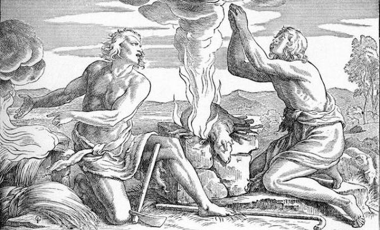 Na nebu se pomaljaše zvezda koja još ne beše dobila ime. Pri svetlosti plamena Kain primeti na Aveljevom čelu beleg od kamena, ispusti hleb koji prinosaše ustima i zamoli da mu bude oprošten zločin.