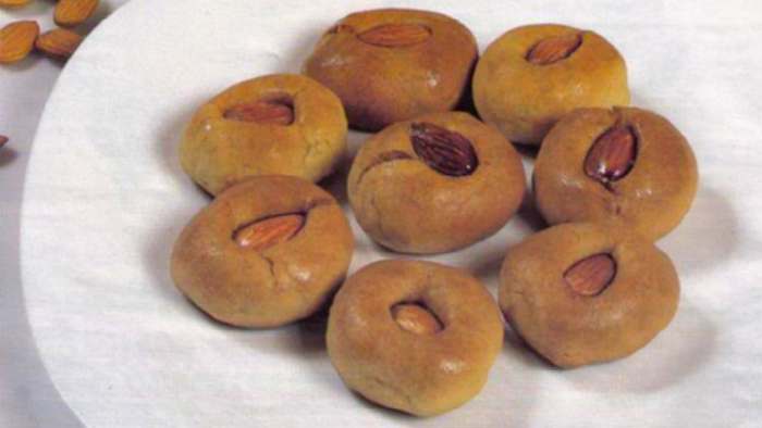 Tepsiju premažemo margarinom, formiramo loptice i ređamo u tepsiju. Na svaku lopticu stavimo po jedan badem i pritisnemo ka unutra. Pečemo 20 minuta na 180 stepeni.