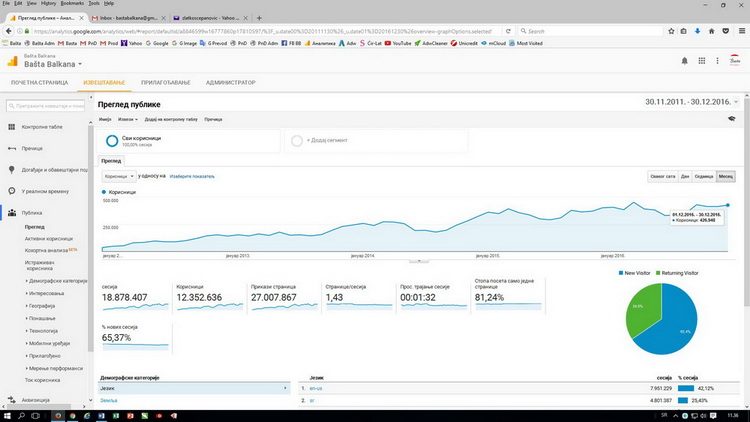 Imam razlog da se kao osnivač Bašte Balkana pohvalim i da prenesem svim našim posetiocima, svojim prijateljima i poznanicima da je sajt i web magazin Bašta Balkana ovu godinu završio sa skoro 4 miliona jedinstvenih posetilaca (unique visitors). Tako veliki broj poseta Bašte Balkana nas svrtava u krug Top 50 najposećenijih srpskih sajtova.