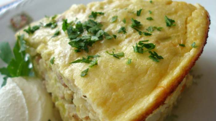 U tiganju sa rastopljenim margarinom ispržimo sitno seckani luk. Kada omekša, dodamo iseckanu šunku, posolimo i pobiberimo. Dodamo grašak, brašno i mleko. Polupamo jaja i odvojimo belanca od žumanaca. U sud sa žumancima dodamo sadržaj iz tiganja, izrendani sir, izrendani muskatni oraščić i promešamo. Mikserom mutimo belanca, posolimo pa sjedinimo sa prethodno pripremljenom smesom.
