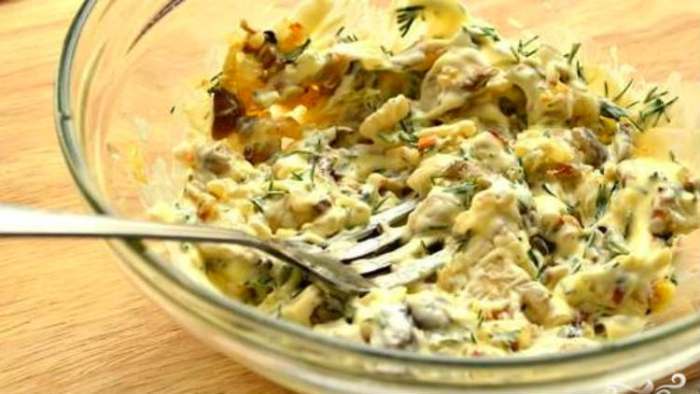 Isečemo pile na parčiće, posolimo sa obe strane i pržimo u zagrejanom tiganju. Pečurke iseckamo na parčiće i pržimo u tiganju s rastopljenim puterom. Kada omekšaju, dodamo sitno iseckane češnjeve luka. Posolimo, pobiberimo i začinimo majoranom.