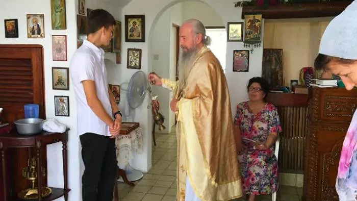 Kapela je u prizemlju kuće, a kada smo stigli već je bila puna vernika — Rusa i Ukrajinaca. Uglavnom su to diplomate — predstavnici ruske ambasade, lekari i biznismeni i njihove porodice, koji žive i rade u ovom rajskom kutku planete. Među njima je bila i jedna Kreolka — prva Sejšelka koja je primila pravoslavlje. Krstio ju je otac Sergios.