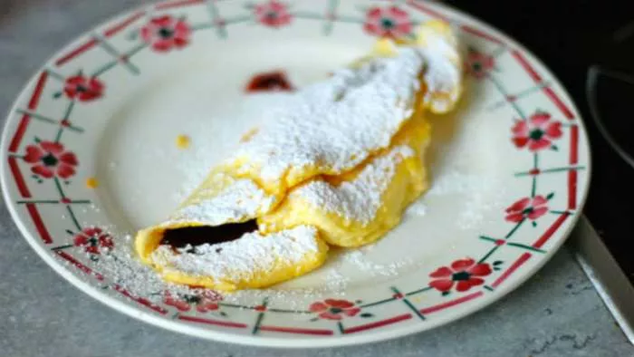 Kada omlet bude gotov, možete ga po želji ukrasiti želeom, kandiranim voćem, bademom ili jednostavno ga posuti prah šećerom.