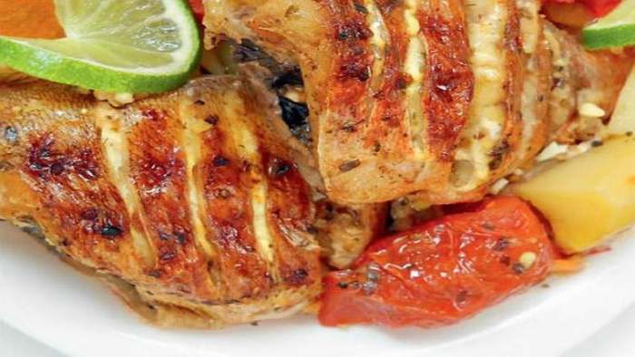 Očišćenim škarpinama odsečemo rep i peraja, zasečemo ih na nekoliko mesta, odstranimo krljušti, operemo, posolimo i pobiberimo sa obe strane. Ribu stavimo u nauljenu tepsiju. Prelijemo limunovim sokom, dodamo krupnije parčiće krompira, posolimo i pobiberimo. Ribu i krompire poprskamo maslinovim uljem. Pečemo 20 minuta na 220 stepeni.