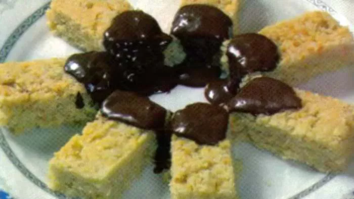 Istopimo čokoladu na pari. Dodamo ulje da čokolada dobije sjaj. Stegnutu bajaderu isečemo na parčiće i u krug ređamo na ciniju za serviranje. Na jedan kraj bajadere kašikom nanasemo rastopljenu čokoladu.
