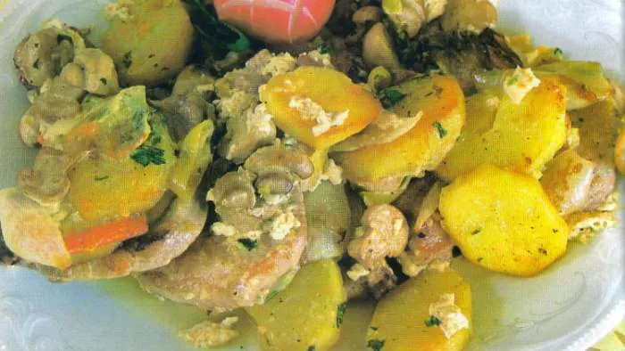 U tiganj sa zagrejanim uljem propržimo krompir, luk i šampinjone pojedinačno. Potom propržene sastojke sjedinimo i dopržimo. Posolimo, pobiberimo i promešamo. Dodamo sitno seckani peršun, ljute paprike isečene na parčiće i kajmak. Prespemo u vatrostalnu činiju ceo sadržaj tiganja.