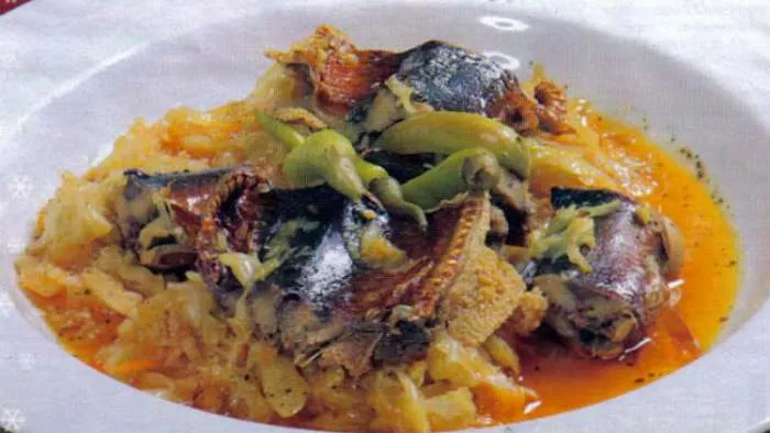 Kupus sitno isečemo i pržimo u šerpi sa zagrejanim uljem. Ribama odsečemo glave i repove i isečemo ih na parčad. U šerpu sa kupusom sipamo 200 mililitara vode, začinimo mešavinom začina, dodamo šećer, crvenu mlevenu papriku i promešamo.