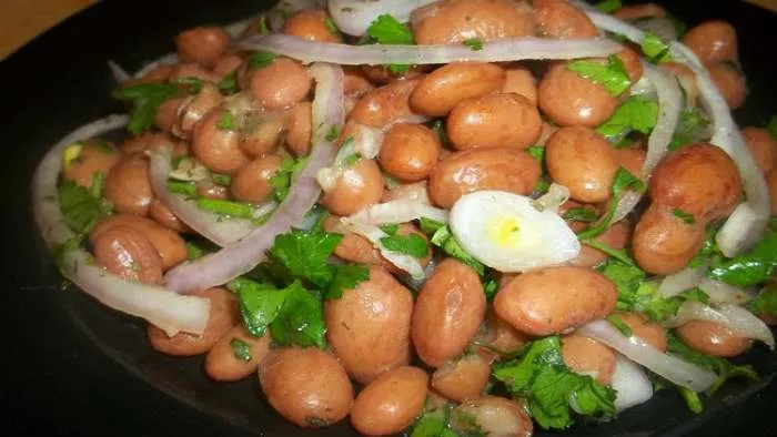 Dobro skuvati pasulj ali paziti da se zrna ne raspadnu. Procediti ga, zrna staviti u činiju za salatu, a šolju tečnosti u kojoj se pasulj kuvao ostaviti na stranu. Dok se pasulj kuva pripremiti orahov sos.