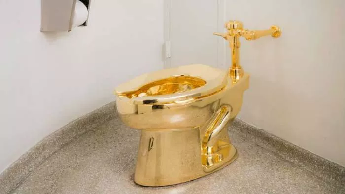 To je „interaktivna instalacija“ italijanskog umetnika Mauricija Katelana nazvana „Amerika“, koju su kritičari opisali kao satiru usmerenu na preterano bogatstvo u SAD.