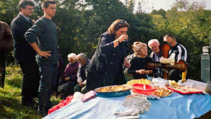 Ovaj dan je bio važan za porodicu mog prijatelja. Mnogo rodbine i prijatelja je došlo da oda počast pokojniku. Svi su se dobro pripremili za komemorativnu večeru. Doneli su mnogo ukusnih jela: svinjsko pečenje na ražnju, salate, pite, sireve, vino, pivo, rakiju, kafu i čak jednu ogromnu tortu sa mnogo šlaga. Takođe, morali su i da ponesu prelepi stolnjak, plastične tanjiriće i čaše, salvete, peškire, i najvažnije – sveće. Sve je potom spakovano u kola i krenuli smo ka groblju. Kada smo stigli, žene su prekrile grob stoljnjakom.