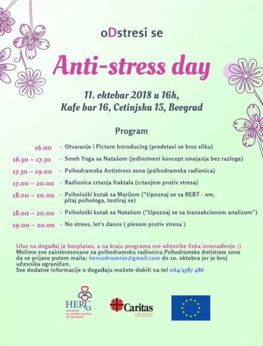 U okviru kampanje za promociju i unapređenje mentalnog zdravlja, Udruženje za podršku ljudima sa neurozom “Herc” organizuje “Antistress Day” u Kafeu 16, 11. oktobra od 16 sati, ulica Cetinjska 15 u Beogradu.