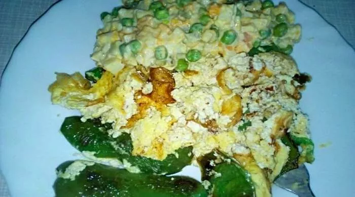 Dve kašike sira bile su dovoljne da se upotpuni ova neobična kuvarska mešavina. Dok se to sve krčkalo u tiganju, umutio sam dva jaja i prelio preko. Sačekao sam da se zapeče donja strana i prevrnuo masu.