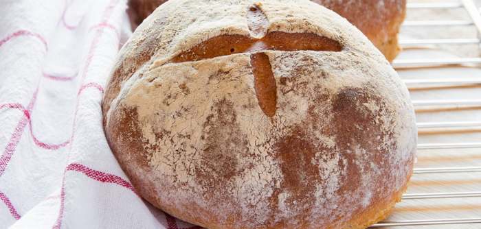 Peći u dobro zagrejanoj rerni na 220c. Peći hlebove 35 minuta ili dok fino ne porumene. Kad je pečen malo ga poprskati sa vodom sa svih strana i na kratko zaviti u kuhinjsku krpu. Ostaviti da se potpuno ohladi pre rezanja
