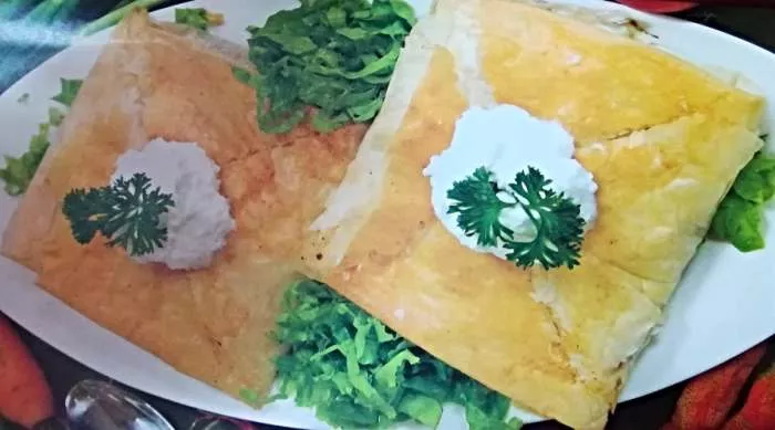 Dve kore premažemo prethodno rastopljenim puterom. Nanesemo još jednu koru, pa i nju premažemo rastopljenim puterom. Na sredinu kora nanesemo deo fila i prekrijemo sa dva kraja kora. Potom dva slobodna kraja kora uvijemo ka unutra. Na isti način pripremamo i drugu rouladu. Premažemo puterom i stavimo u tepsiju, koju smo premazali puterom. Pečemo 10 minuta na 200 stepeni.