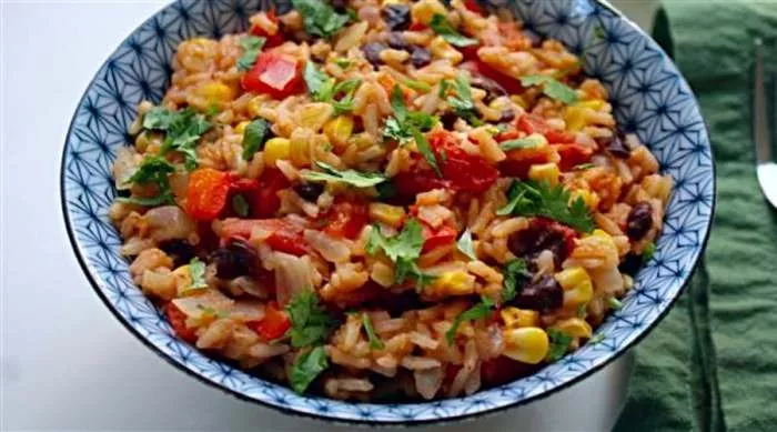 Kuvamo pirinač 20 minuta u uzavreloj i slanoj vodi. Cedimo i properemo hladnom vodom. Isceđeni pirinač serviramo na činiju. Dodamo u njega zrna kukuruza, skuvani grašak, seckani lu, belo i crno suvo grožđe. Pomešamo maslinovo ulje, senf i sirće. Posolimo, pobiberimo, pa ovim sosom prelijemo salatu. Stavimo je u frižider, pa salatu poslužimo hladnu.