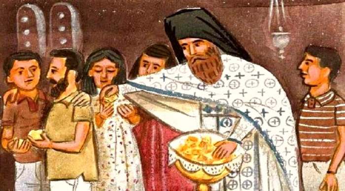 Polako u redu, prilazi se svešteniku koji deli naforu. Kada se dođe na red, prvo se prekrsti, a zatim na dlan leve ruke prekrsti se desni dlan i priđe se svešteniku, koji na ispruženi dlan stavlja kockicu nafore.