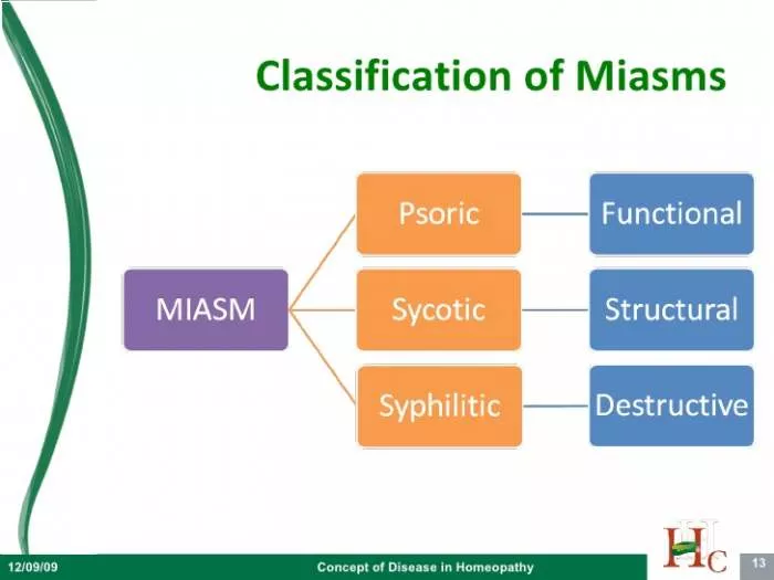 Te mijazme je on prepoznao kod pacijenata koje je lečio i nazvao sledećim imenima – mijazam psora (šuga, guba), mijazam sikosis (gonoreja) i mijazam sifilis.