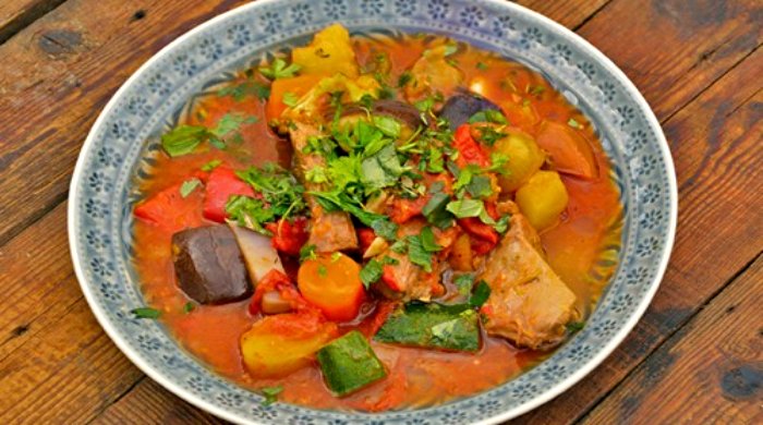 Pečemo 2 sata na 220 stepeni, pa kad je gotovo mesarski đuveč serviramo na tanjir i dekorišemo listovima peršuna.