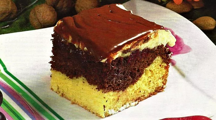 Kada se sastojci sjedine, deo testa nanesemo u nauljenu, četvrtastu, vatrostalnu posudu. U preostalo testo dodamo kakao, promešamo i nanesemo u posudu preko žutog testa. Preko testa rasporedimo višnje iz kompota. Pečemo 20 minuta na 180 stepeni.
