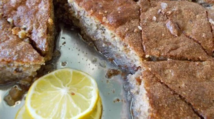U podmazan i pobrašnjen pleh sipati masu, poravnati je i peći pola sata na 180 stepeni. Pečen kolač iseči na trouglove pa topao preliti sirupom i ostaviti na hladnom da upije sirup.