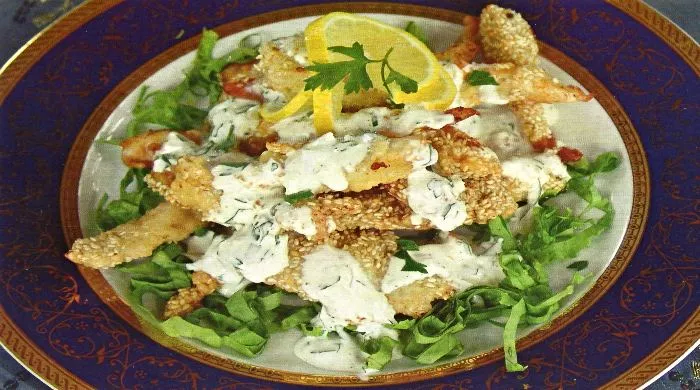 Na činiju za serviranje sitno iseckamo listove zelene salate. Poređamo parčad mesa i prelijemo sosom. Nanesemo presotalu zelenu salatu.