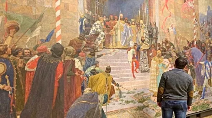 Kako naglašavaju iz muzeja, kompozicija „Krunisanje cara Dušana”, veličine preko dvadeset metara kvadratnih sa temom koja prikazuje čin krunisanja cara Dušana u Skoplju 1346. godine, naslikana je kao porudžbina Kraljevine Srbije za potrebe učešća na Svetskoj izložbi u Parizu 1900. godine.