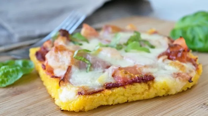 Mikserom izmutimo belanca i dodamo u sud sa palentom. Dodamo deo izrendanog kačkavalja, krugove zelenih i crnih maslinki i parčad konzerviranog paradajza. Sjedinimo sastojke i prespemo u nauljenu tepsiju. Dodamo preostali rendani kačkavalj, tanke listove šampinjona i marinirane šampinjone. Poređamo i krugove šunke. Pečemo 30 minuta na 230 stepeni.