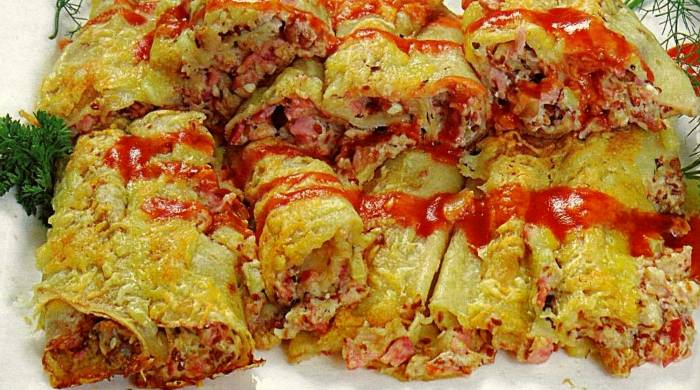 Prvu palačinku premažemo filom, uvijemo u rolat i ređamo u vatrostalnu posudu namazanu uljem. Na isti način pripremimo sve palačinke, pa onda na svih 10 savijenih palačinaka sitno izrendamo kačkavalj.