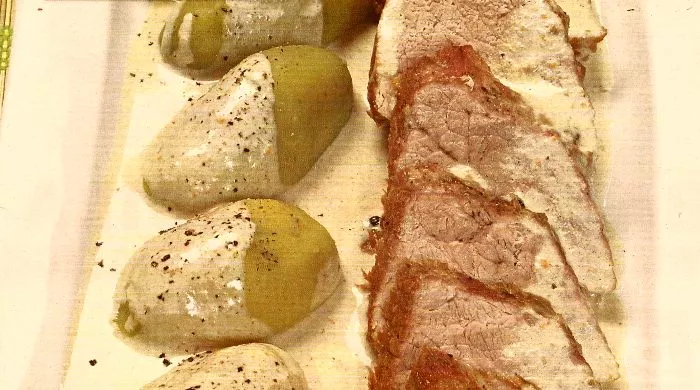 Češnjeve belog luka isečemo na parčad po dužini. Meso posolimo sa svih strana i pobiberimo. Zasečemo meso nožem na više mesta. U rezove stavimo parčad belog luka, uvaljamo meso u brašno i pržimo u šerpi na rastopljenom puteru i zagrejanom ulju.
