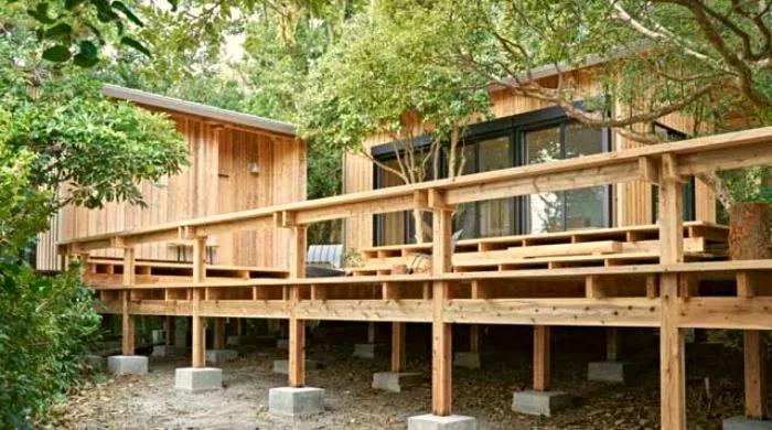 Same kuće su pažljivo postavljene kako bi se maksimalno iskoristile prednosti obližnje vode i protoka vazduha. Projektovane su oko postojećeg drveća i odignute od tla radi minimalnog uticaja na prirodu. Pogled na okolni pejzaž dizajneri su iskoristili kako bi podstakli vezu sa prirodom. Ova ideja se dalje sprovodi otvorenim stazama za šetnju između kabina za spavanje i zajedničkih prostorija.