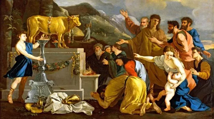 Takođe, neću se zadržavati na onome šta su Jevreji činili kada su došli u „obećanu zemlju” sa tobože božijim nalogom da tamo pobiju sve što zateknu; o tome detaljno izveštavaju knjige Starog zaveta. (Samo dva primera: „I pobiše ga, i sinove njegove i sav narod njegov, da ne osta nijedan, i osvojiše zemlju njegovu” – Četvrta Mojsijeva, 21:35; „I pobiše sve živo što beše u njemu oštrim mačem sekući, te ne osta ništa živo, a Azor spališe ognjem” – Ješue ili Jozue Nunova, 11:11.) Govoriću o nečem što je ostalo neprimećeno. Na svom putu, već preobraćeni od strane Mojšea u novu veru, Jevreji su na nekoliko nedelja ostali bez njega – on je otišao na goru Sinajsku da primi „Deset Božijih zapovesti“ od, kao što je rečeno, samog JHVH-a (Jehove, Jahvea ili već kako god). Moše je, očigledno, u torbu u kojoj je morao poneti hrane, tajno ubacio čekić i dleto, kojima će napraviti kamene ploče i urezati „Božije” reči u njih. Sve to je trajalo dosta dugo (nije se mogao u samom logoru „uvežbavati” u tome!), tako da je njegov narod počeo da se koleba i „videvši kako Mojsije zadugo ne silazi s gore, skupi se pred Arona i reče mu: načini nam bogove koji će ići pred nama, jer ne znamo šta je s onim Mojsijem koji nas izvede iz zemlje egipatske” (Druga knjiga Mojsijeva, 32:1). Aron, inače Mojsijev brat i veliki sveštenik nove jednobožačke religije, umesto da ih odvraća od toga, spremno im reče da poskidaju sa sebe zlatne ukrase (i to samo „zlatne oboce što su u ušima žena, sinova i kćeri), i da mu donesu. Od tih zlatnih prstenova Aron je pretapanjem načinio kip božanstva – malog zlatnog bika veličine teleta (32:4). Kratko o tome šta se desilo kada se Mojsije vratio. Moša se, naime, tada strašno razgnevio, bacio one ploče koje su se polomile (kasnije će otići „kod Boga” po nove, i vratiće se mnogo brže, jer je već imao prakse u pravljenju ploča i urezivanju reči u njih) i naredio odanim ljudima sledeće: „Pripašite svaki mač uz bedro, prođite tamo-amo po logoru i pobijte svaki brata svojega, i prijatelja svojega i bližnjega svojega”(32:27). Njegovi ljudi su to i učinili, i „i pogibe naroda u onaj dan do tri hiljade ljudi”. Naravno, neki od onih koji su učestvovali u salivanju „zlatnog teleta” su već nekako izbegli smrt.