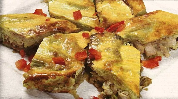Dno nauljene okrugle tepsije prekrijemo isprženim parčadima tikvica. Na tikvice nanesemo isprženu parčad mesa. Ponovo poređamo ispržene tikvice i prelijemo mešavinom iz suda.